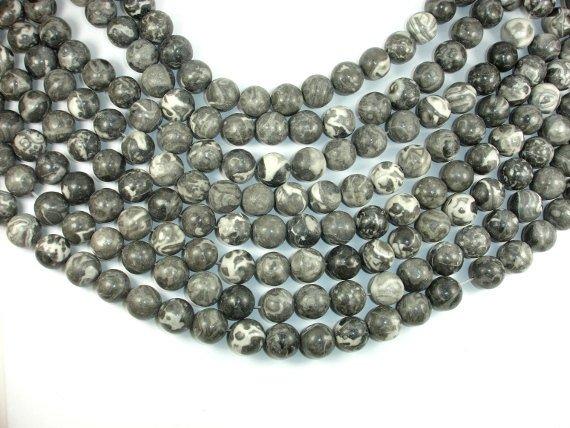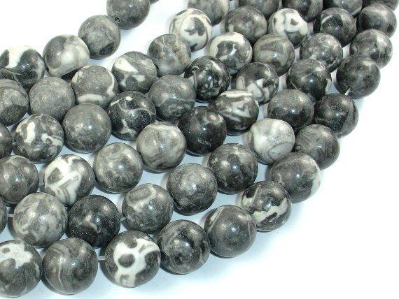 Black Fossil Jasper Beads, 14mm Round Beads, 15.5 Inch